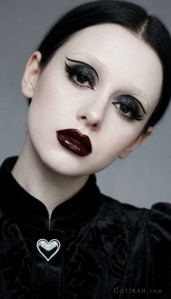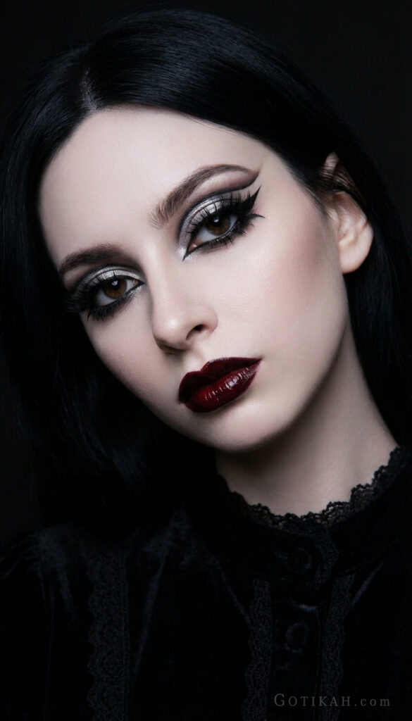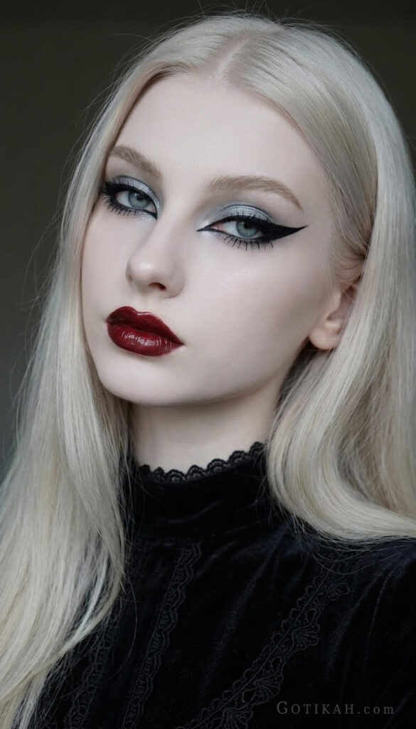 Soft silver shimmer on the eyes paired with classic winged liner and glossy red lips creates a luminous gothic style.