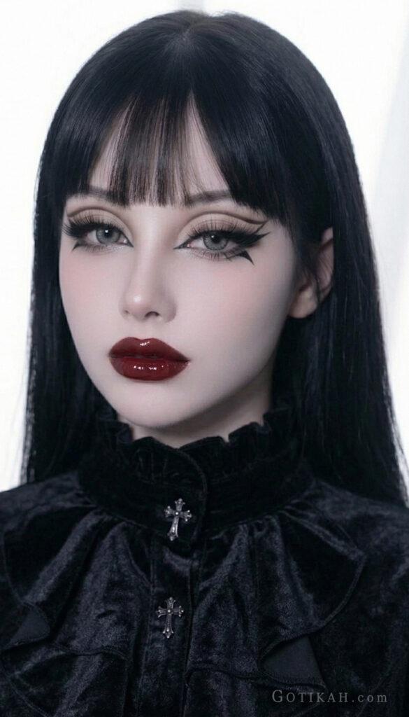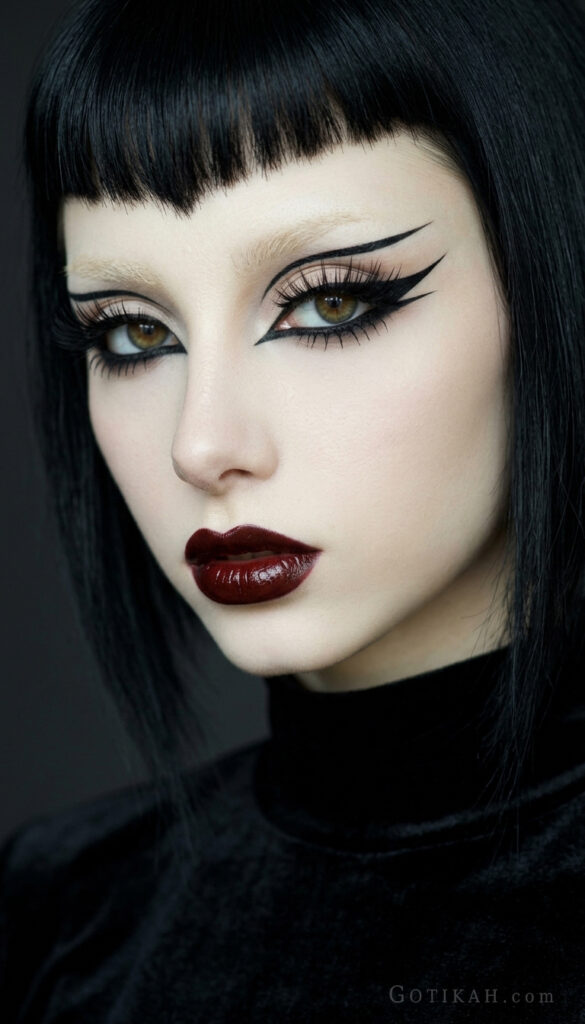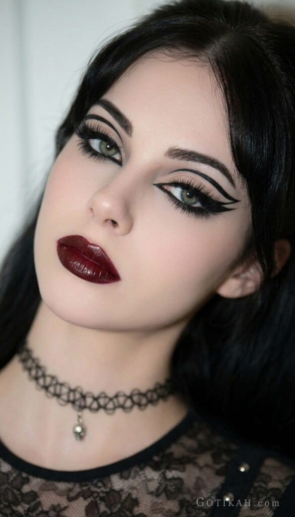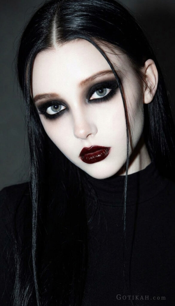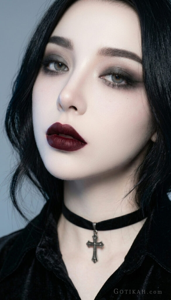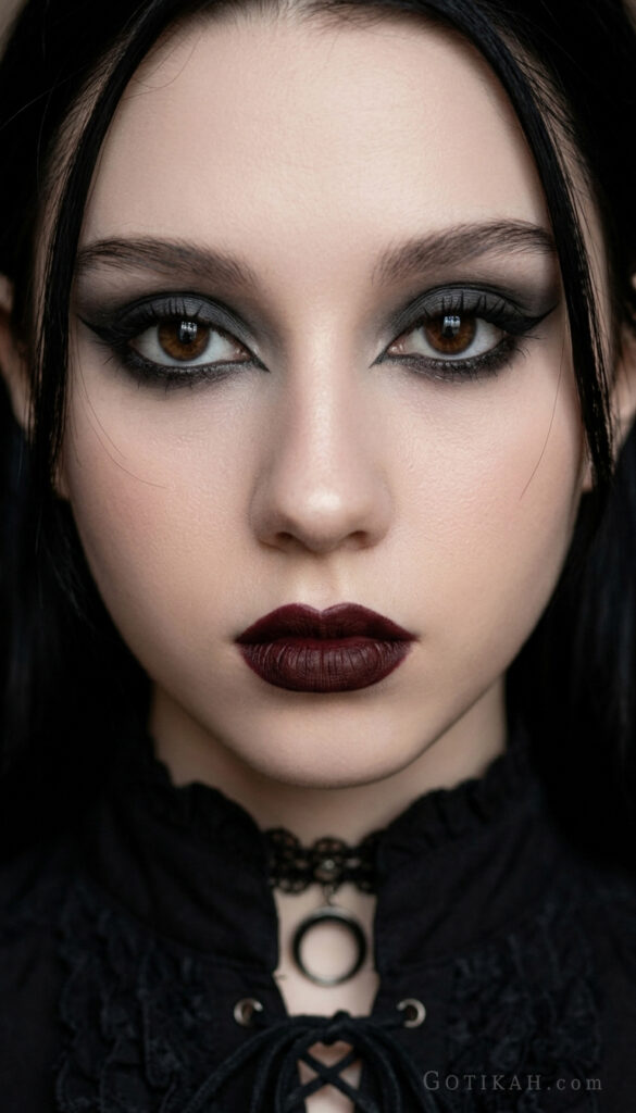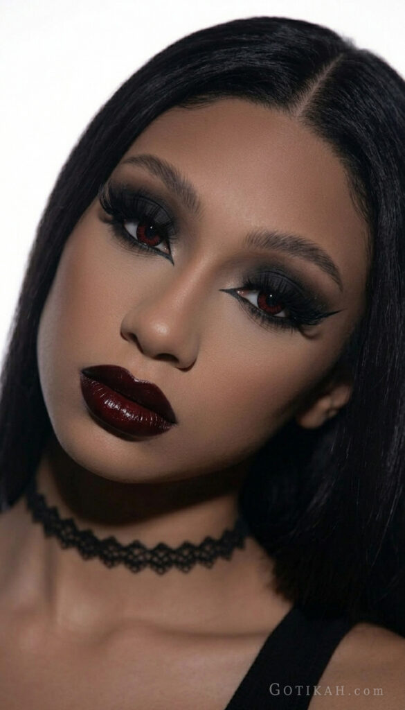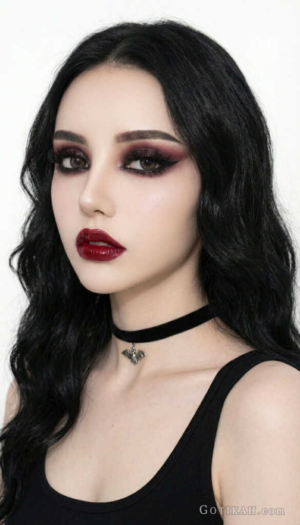 Heavy black smoky eyes paired with deep burgundy glossy lips create a bold, dramatic gothic makeup style. I recommend this, because it’s easy to replicate with just a bit of practice!