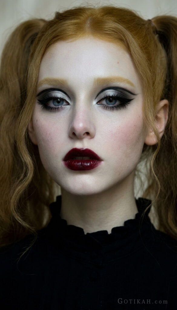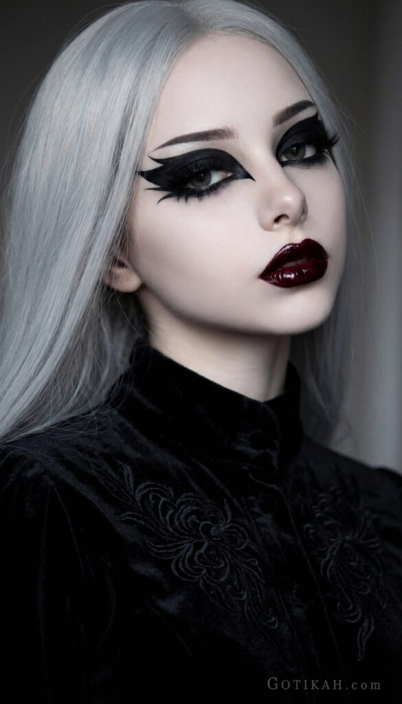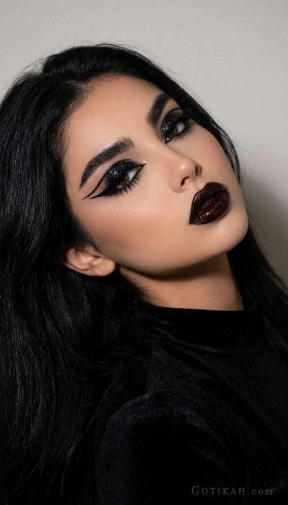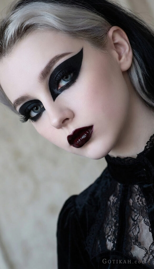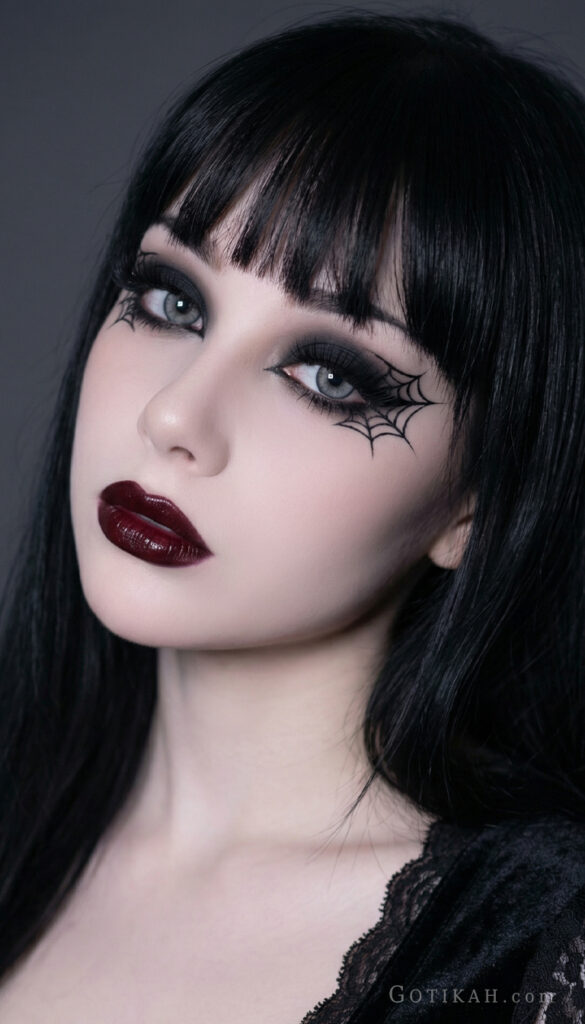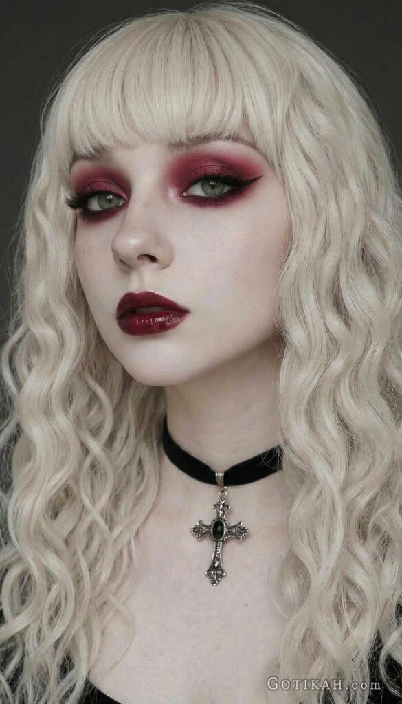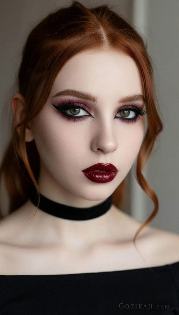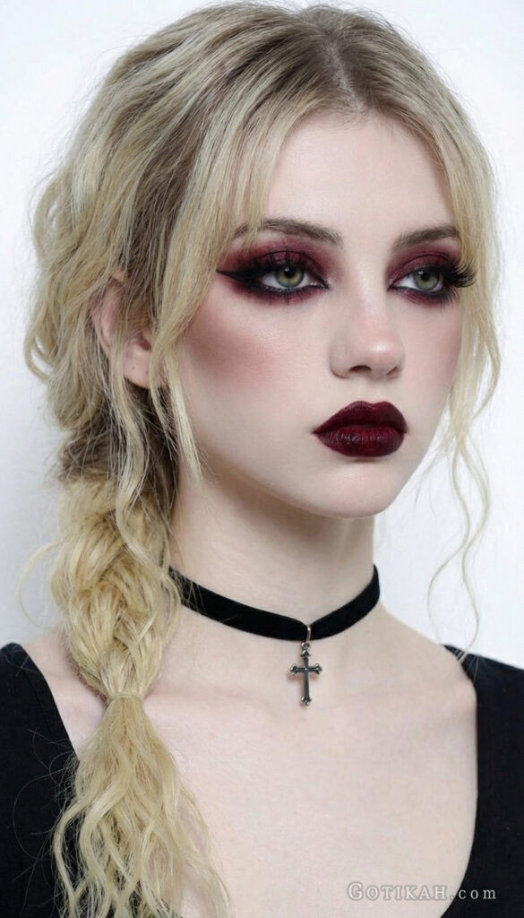 Heavy black smoky eyes paired with deep burgundy glossy lips create a bold, dramatic gothic makeup style. I recommend this, because it’s easy to replicate with just a bit of practice!