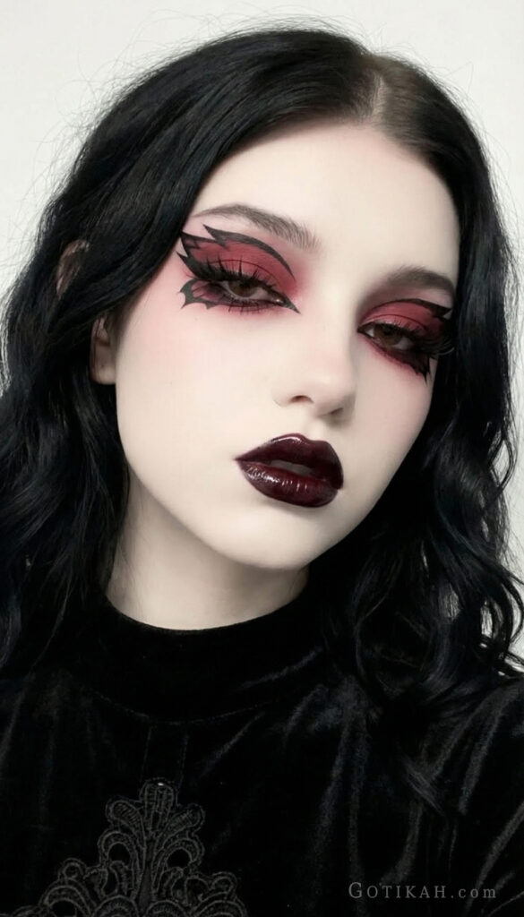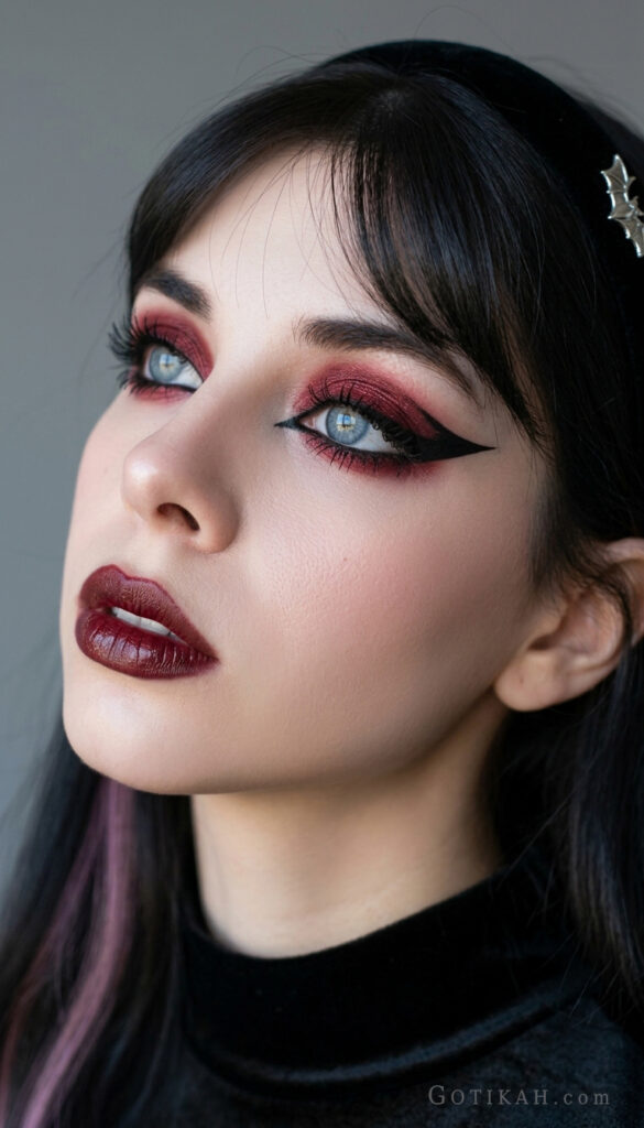 Vibrant red eyeshadow shaped into a lifted wing adds intensity, paired with glossy wine-colored lips for a bold gothic glam look.