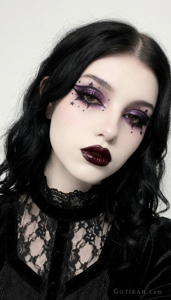 Purple smoky eyes accented with small star details create a dreamy, celestial gothic aesthetic. Try with different eyeshadow “sky” colors as well, pretty nice!