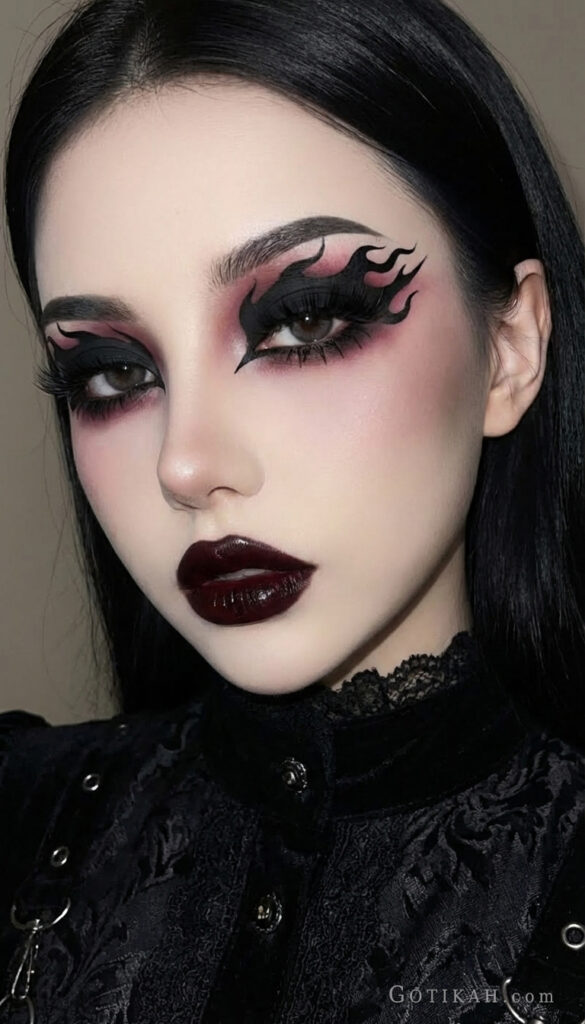 Black and red eyeshadow shaped into flame-like graphic details adds an artistic, edgy gothic touch.