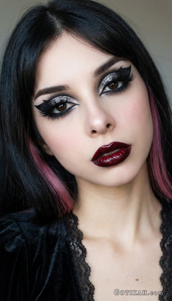 Cool-toned silver and black smoky eyes add depth and shimmer, paired with glossy burgundy lips for a luxe gothic vibe.