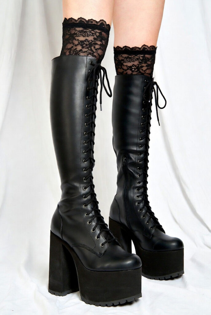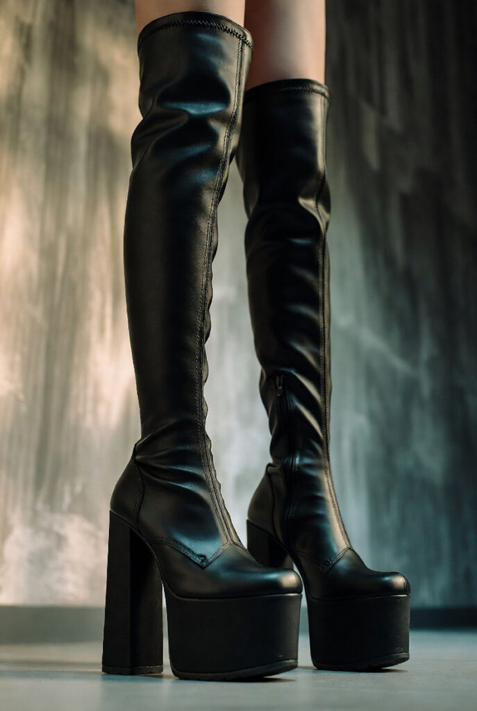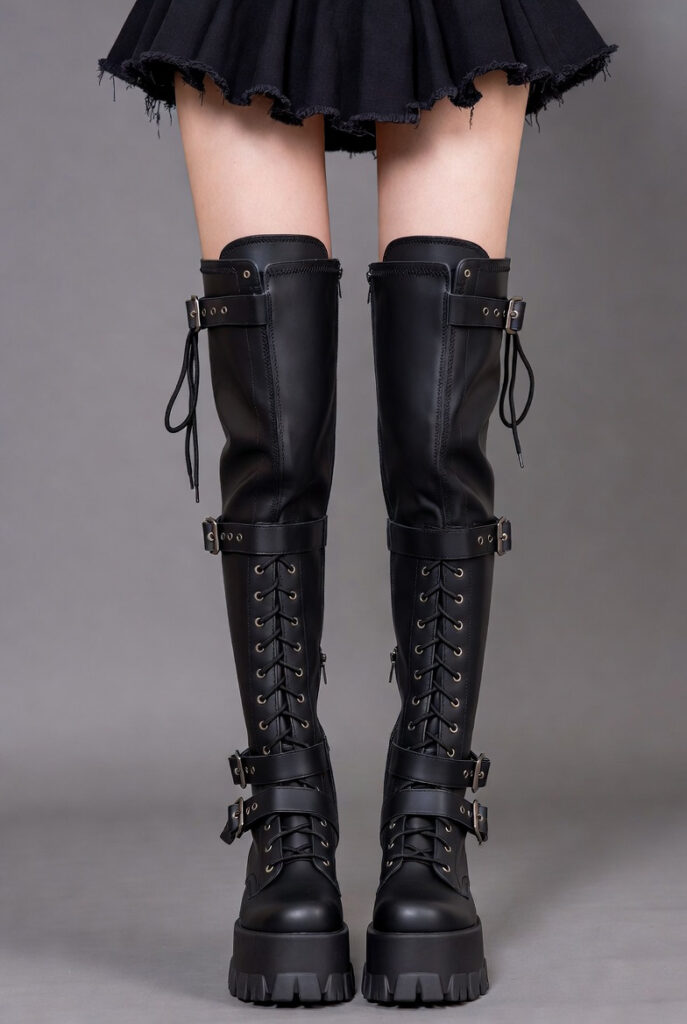Tall platform boots, including knee-high and over-the-knee styles, bring drama and intensity to gothic looks. Their extended height elongates the legs while maintaining a strong and dominant appearance.