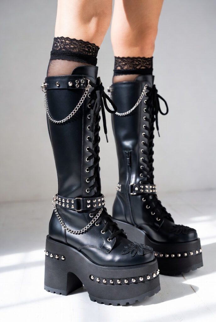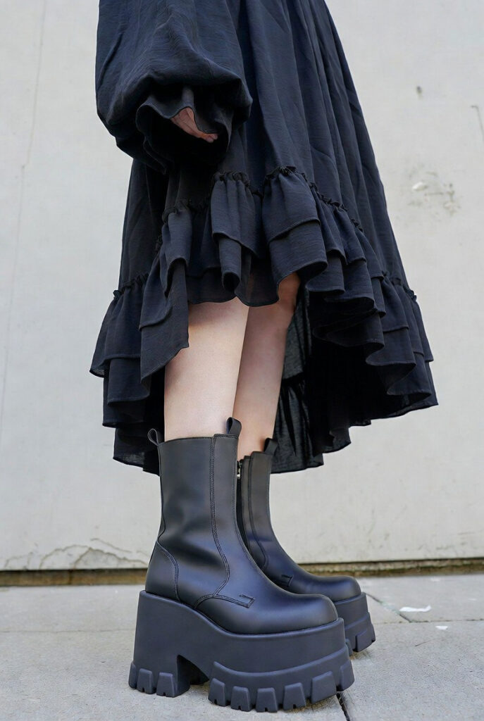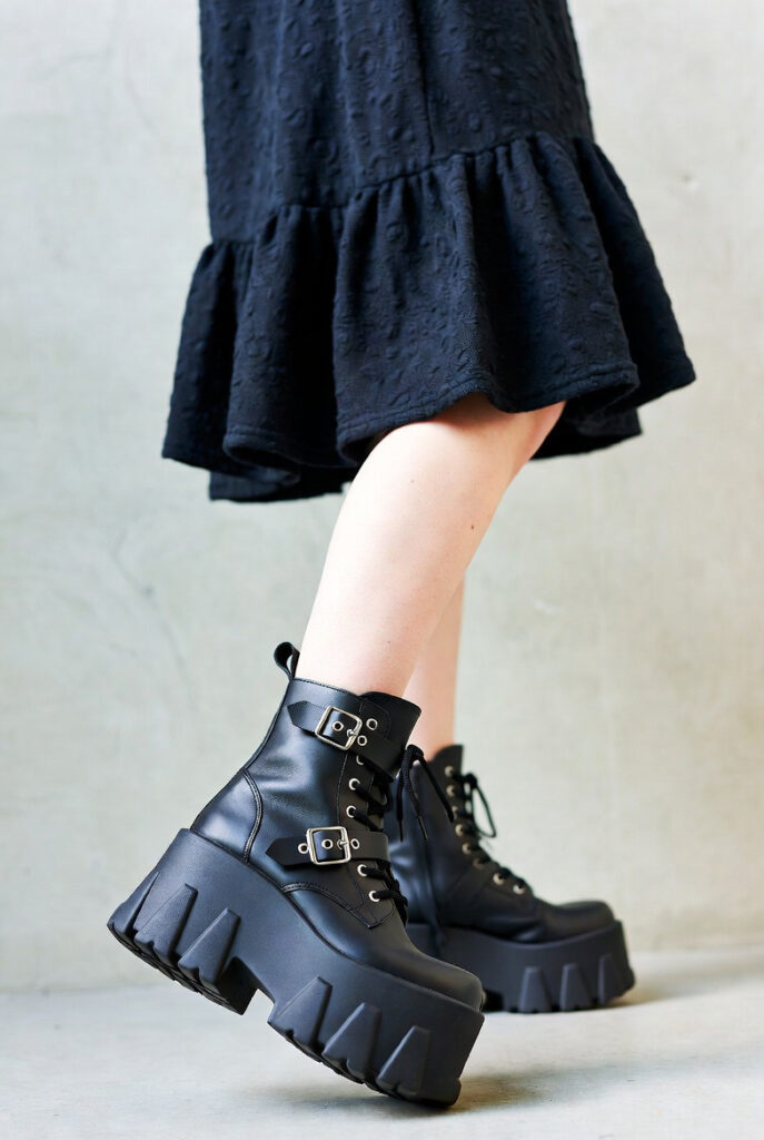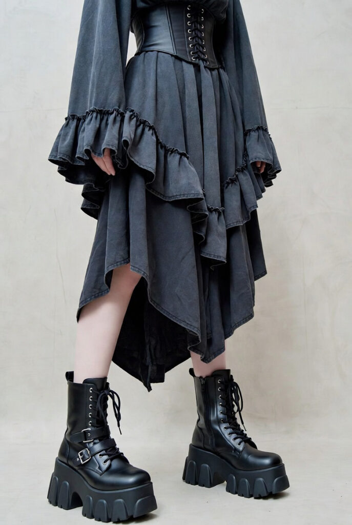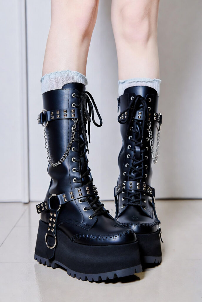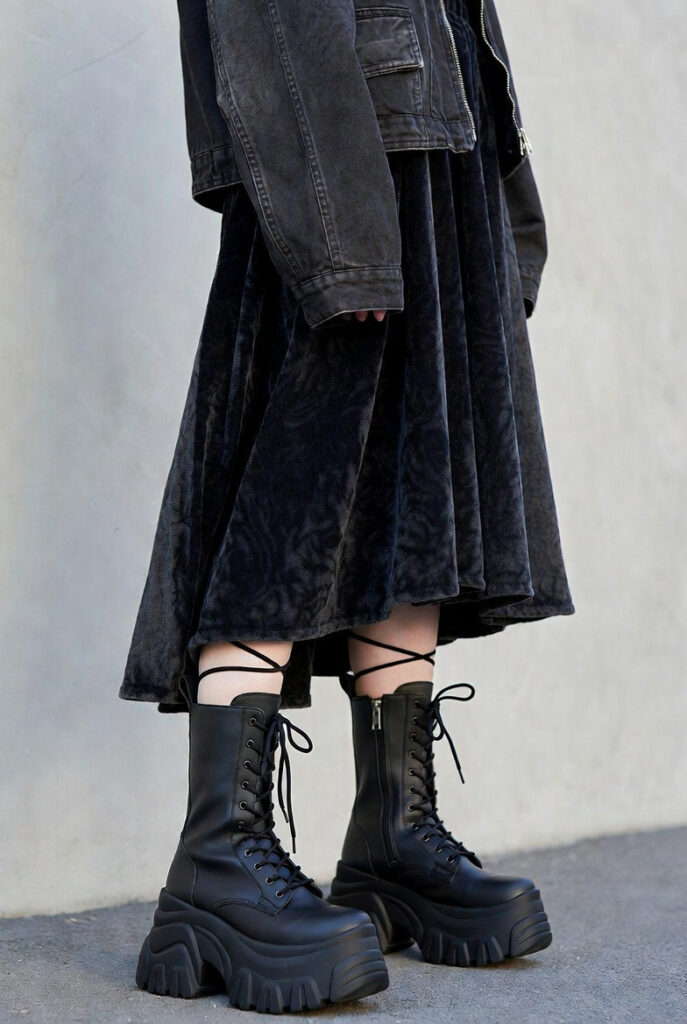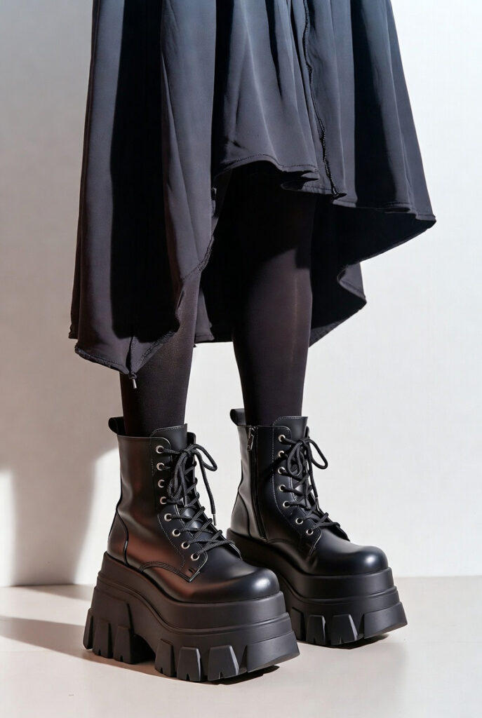 Chunky platform boots focus on exaggerated soles and heavy shapes. This modern gothic style blends street fashion with dark aesthetics, creating bold and contemporary looks.