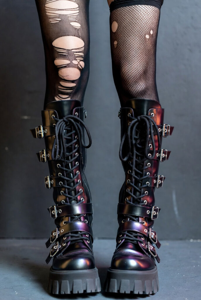 Boots with buckles, straps, and metal details add an industrial and rebellious edge to gothic fashion. These elements enhance the visual weight of the boots, making them bold statement pieces.