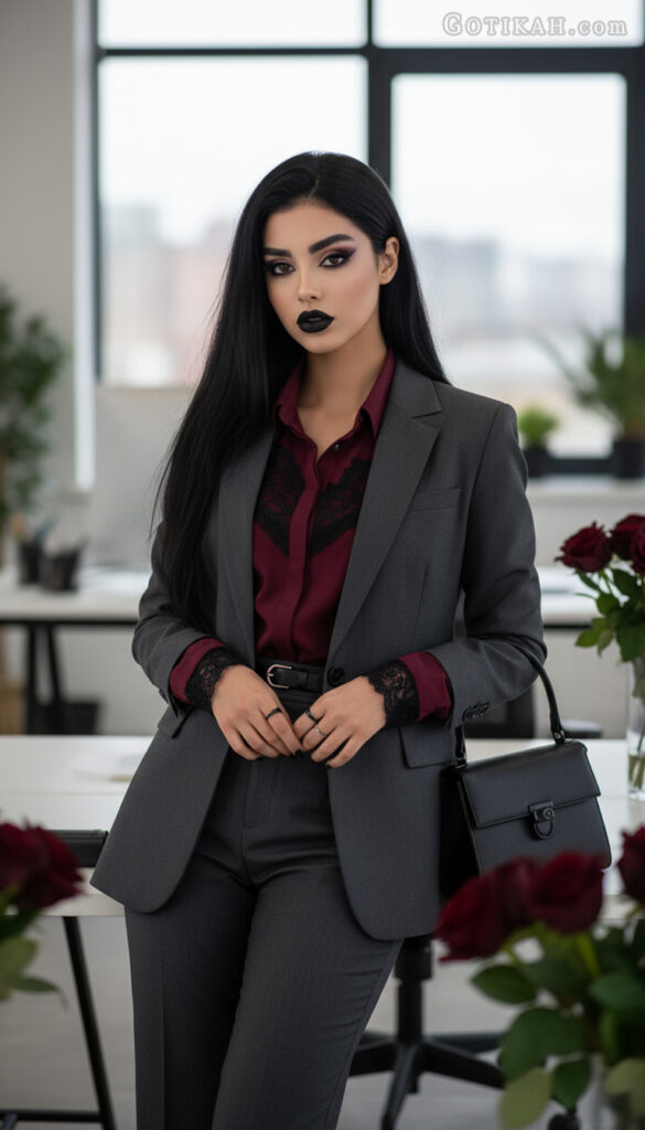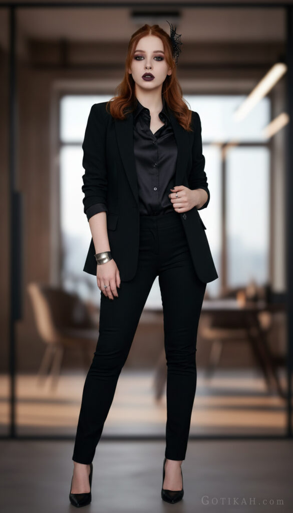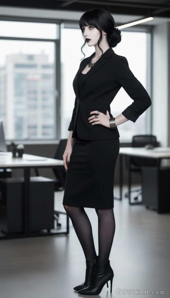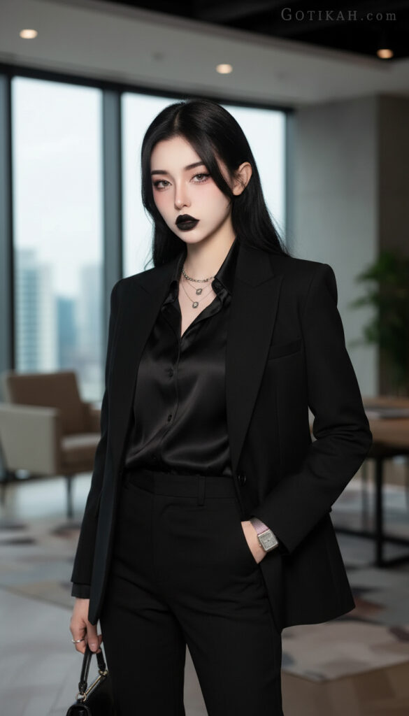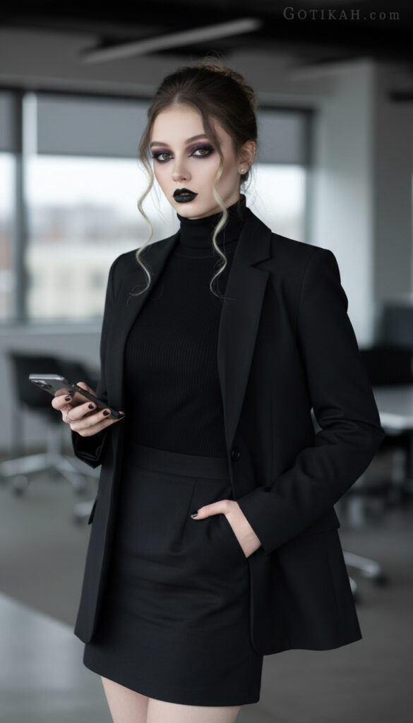 This selection focuses on office-ready goth outfits with authority, restraint, and dark identity.
