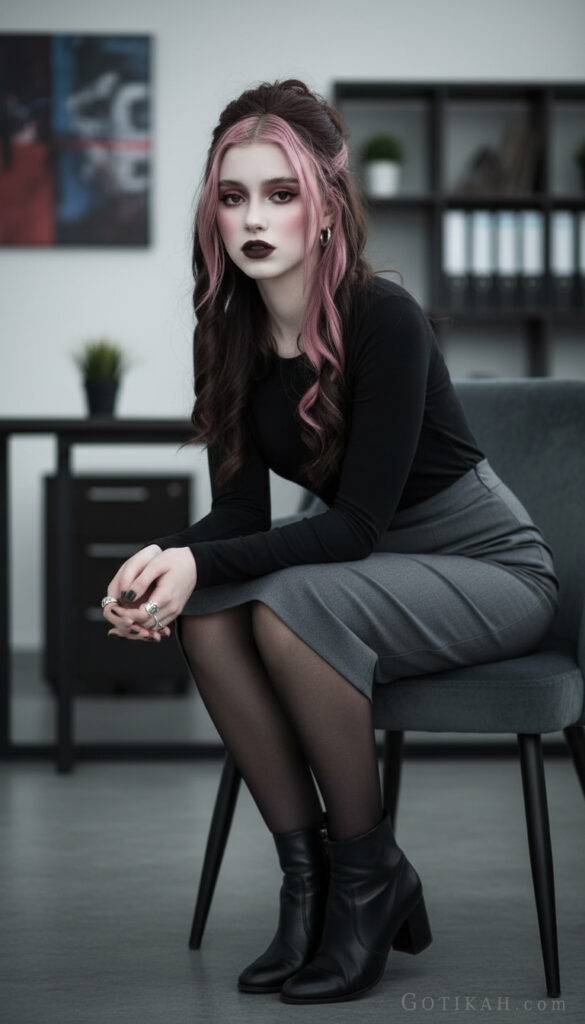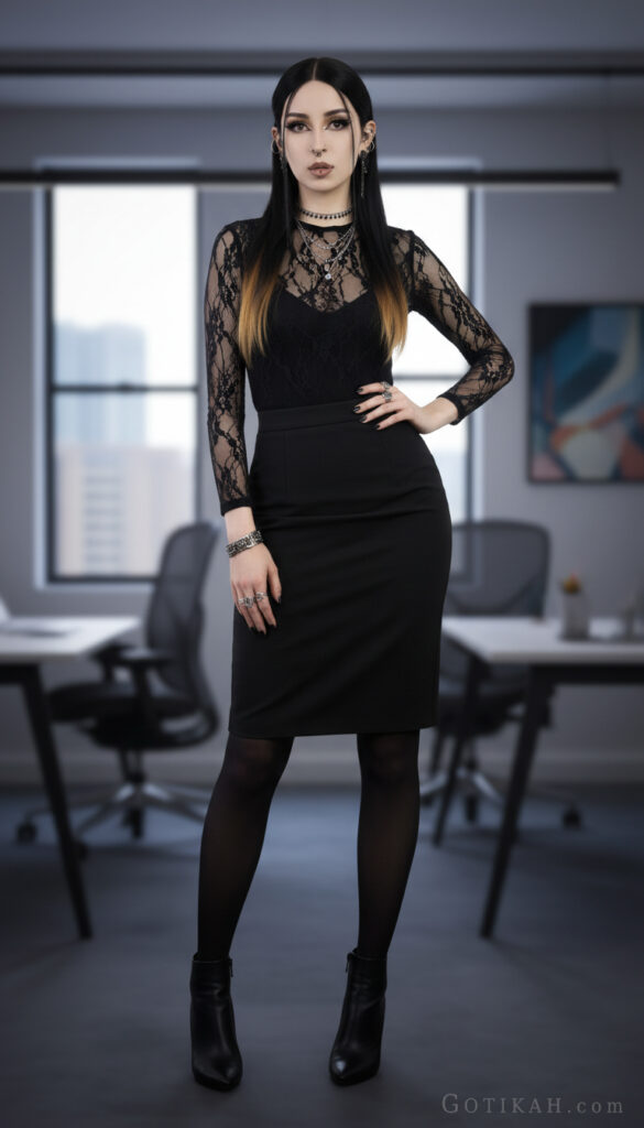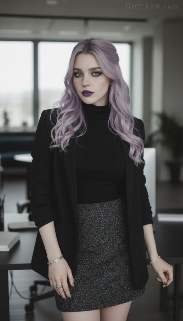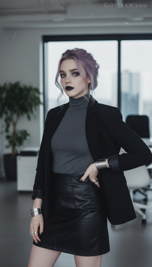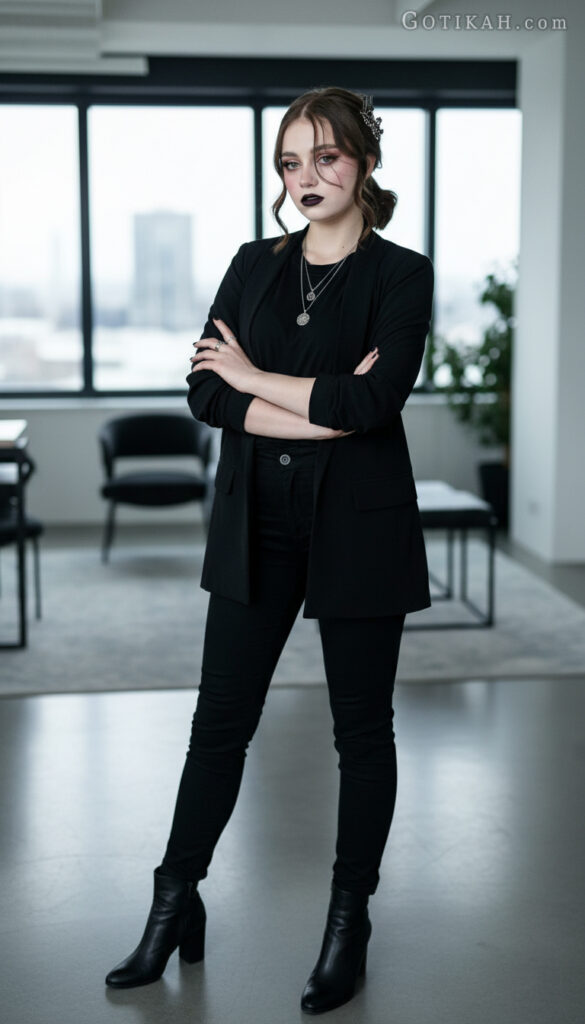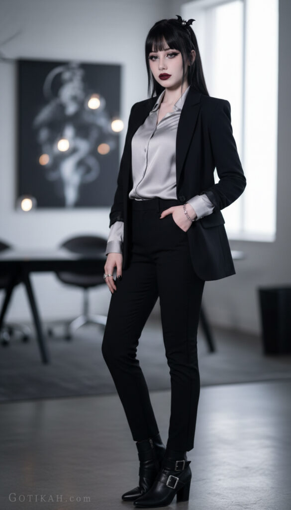 This selection focuses on office-ready goth outfits with authority, restraint, and dark identity.