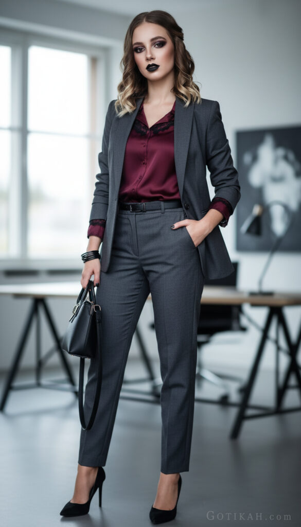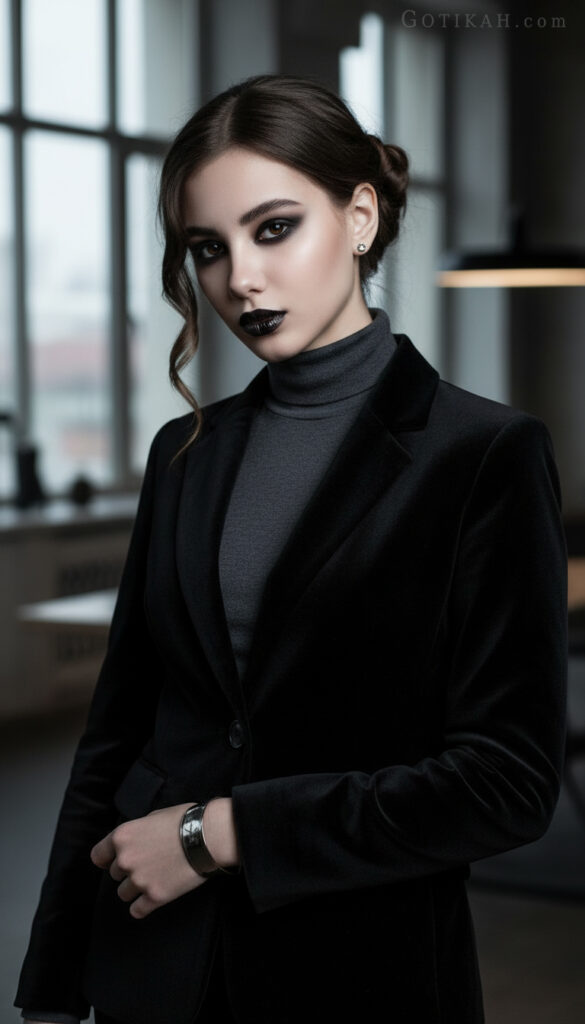 Here you will find inspiration for professional goth outfits, there are sharp tailoring, controlled silhouettes and dark palettes. This aesthetic will make sure you stay in office standards, while incorporating subtle gothic elements.