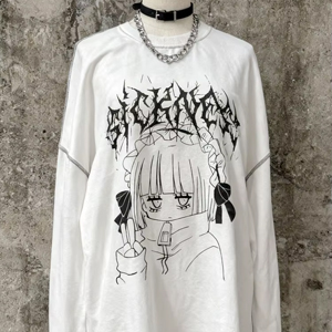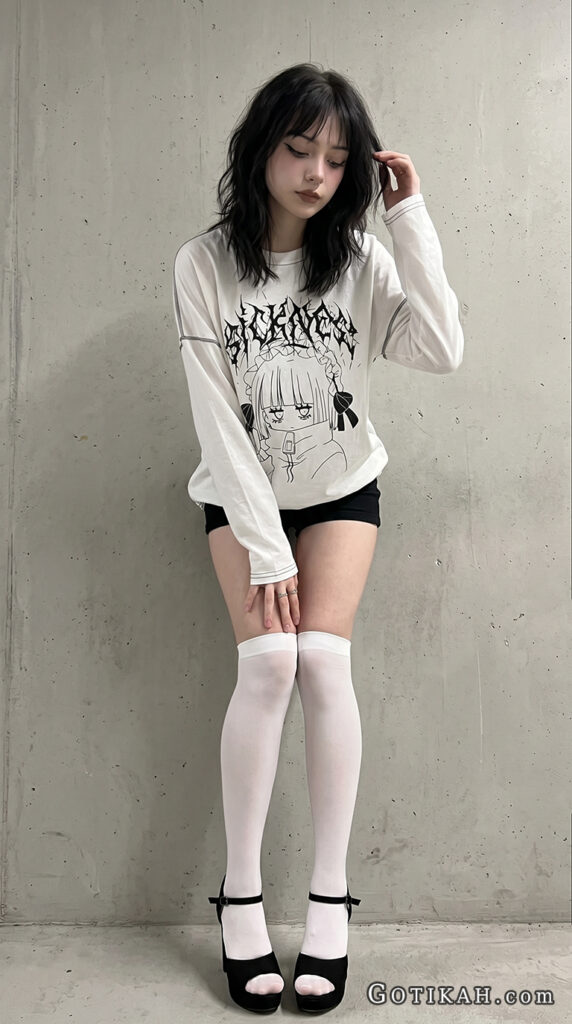 An oversized white graphic sweater paired with black shorts, thigh-high socks, and platform heels. The contrast between light and dark elements gives a soft grunge twist to a gothic-inspired outfit.