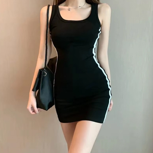 A fitted black mini dress with thin straps that highlights a clean and minimal shape. The simplicity of the piece gives it a refined yet subtly feminine gothic feel.
