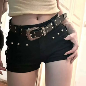 A simple black long-sleeve top paired with high-waisted leather shorts and a studded belt. The look is clean and modern, with a subtle edgy touch that works well for casual city outfits.