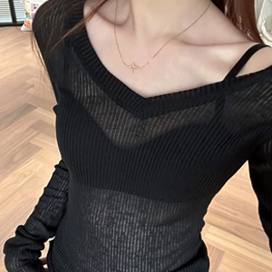 A semi-sheer off-shoulder black knit top layered over a bralette, styled with denim shorts and patterned tights. The look mixes casual pieces with gothic elements, creating a relaxed yet visually interesting outfit.