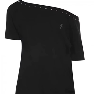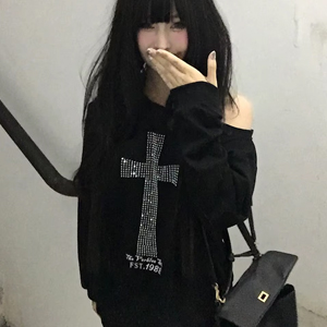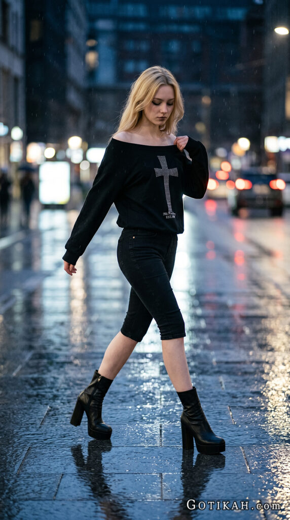 An off-shoulder black top with a cross detail paired with fitted black pants and heeled boots. The outfit leans into a more classic gothic aesthetic with a slightly dramatic touch.