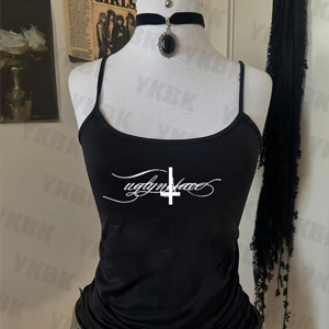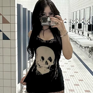 A fitted black lace-trim cami with a bold skull print, styled with dark jeans. This outfit blends feminine details with a classic gothic graphic, creating a balanced soft goth aesthetic.