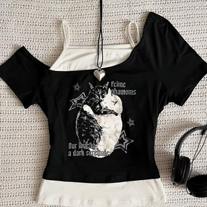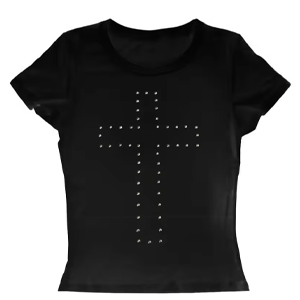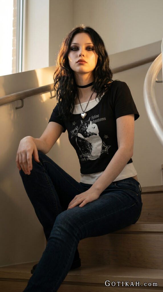 A slim black graphic tee combined with dark jeans creates a sleek and understated outfit. The overall look is minimal, slightly edgy, and perfect for a modern, low-effort gothic style.