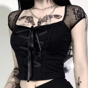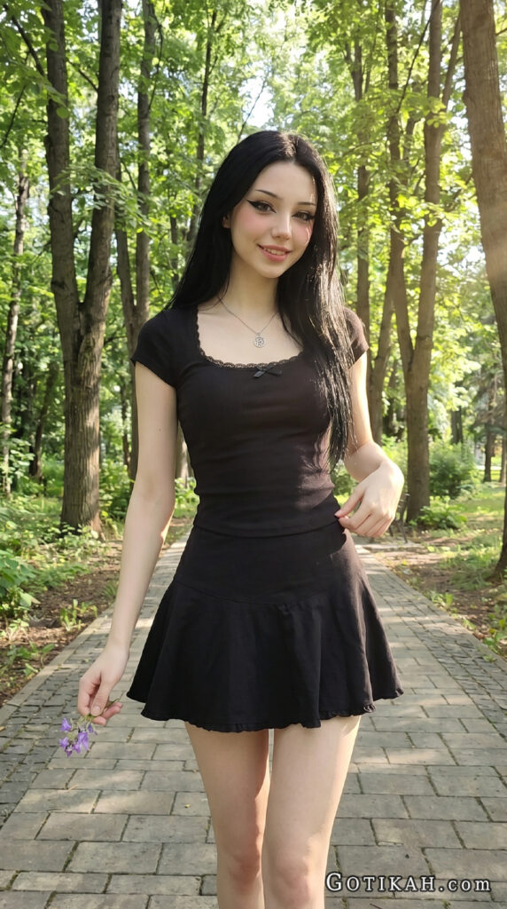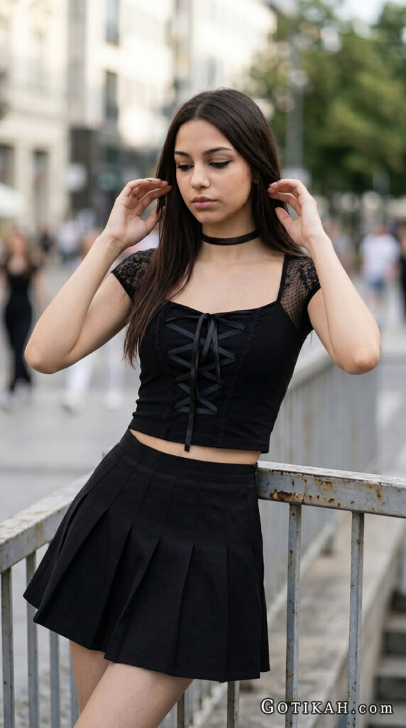 A fitted black top with delicate trim paired with a short flared skirt that moves lightly with the body. This outfit gives a soft, feminine take on gothic fashion while keeping things simple and wearable.