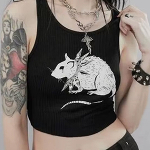A black sleeveless top with a dark print combined with fitted mini shorts and combat boots. The look feels bold and confident, with strong street-style influence and a slightly rebellious edge.