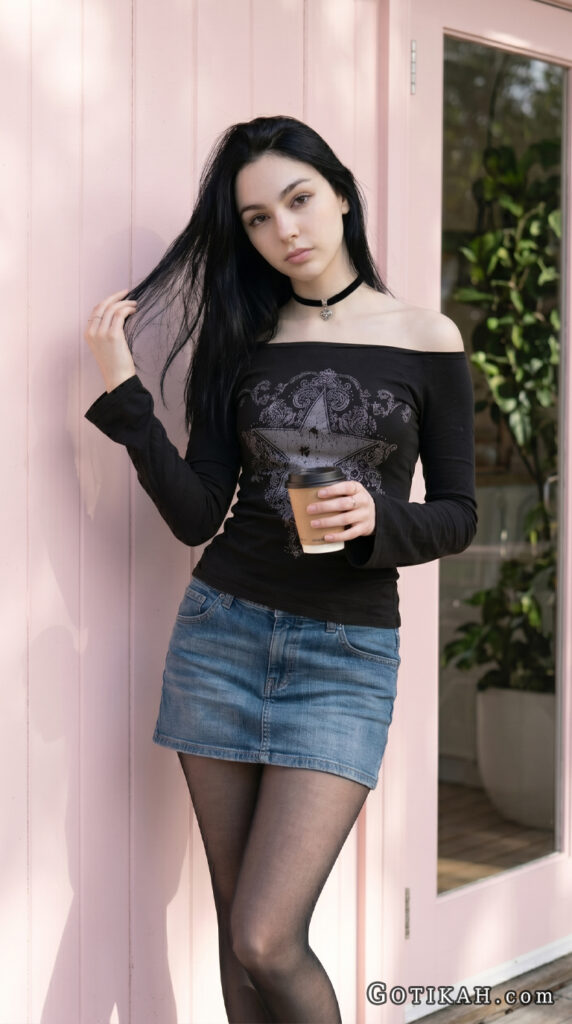 An off-shoulder black top with a subtle dark print paired with a denim mini skirt and sheer tights. The look blends casual elements with soft gothic aesthetics, creating a relaxed yet slightly edgy everyday outfit.