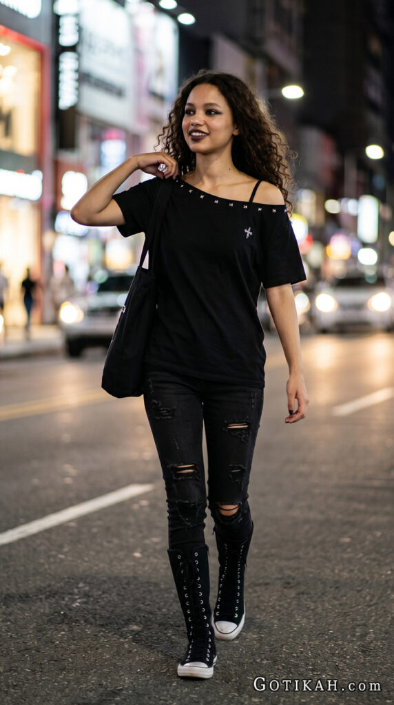 A relaxed black t-shirt paired with ripped skinny jeans and tall lace-up boots. The outfit feels effortless and urban, with a subtle gothic attitude perfect for everyday wear.