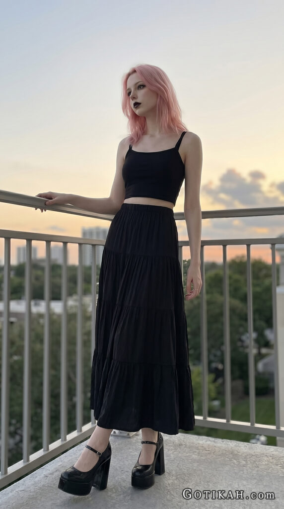 A cropped black tank top styled with a flowing high-waisted maxi skirt and platform shoes. The silhouette is clean and elongated, giving a soft, elegant take on gothic minimalism.