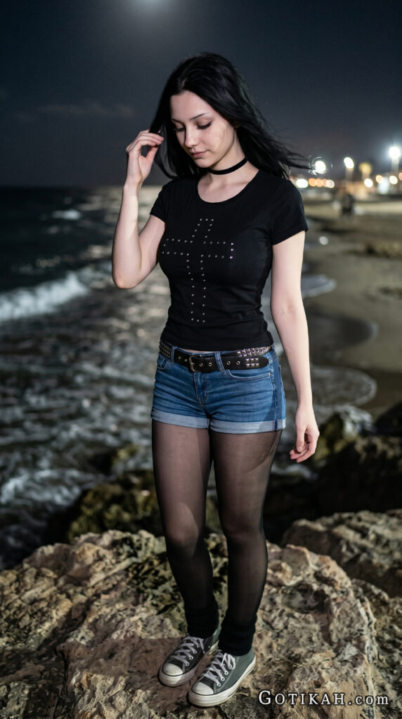 A fitted black t-shirt with subtle detailing styled with denim shorts, sheer tights, and casual sneakers. The look is simple, modern, and easy to wear while still keeping a dark aesthetic.