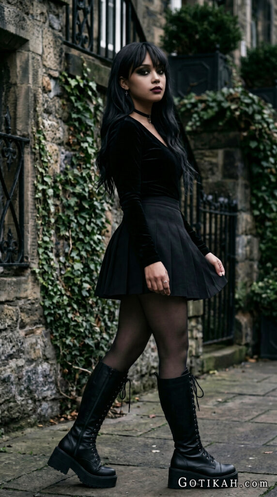 A fitted black long-sleeve top paired with a flared mini skirt, sheer tights, and knee-high boots. The outfit leans into a timeless gothic silhouette, combining structure with a slightly dramatic, dark aesthetic.